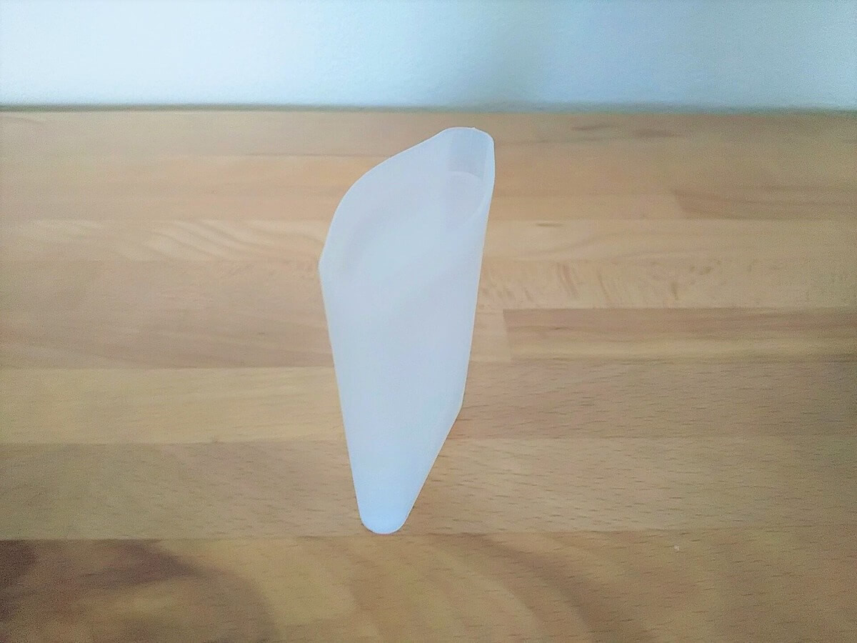一応水を入れると自立しますが、底の面積が狭いので通常のコップのような安定感はありません。グラつきはないものの、「飲み物を入れて机に置いておく」という使い方はちょっと危険。軽い力ですぐに倒れてしまい大惨事に……。