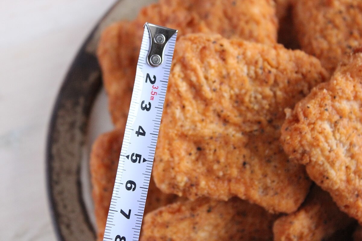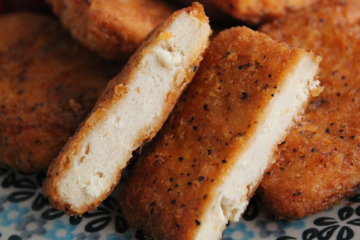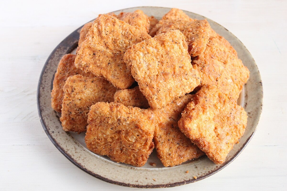 ひき肉のような状態の鶏むね肉に、色々な調味料を混ぜて成型して調理しているのだと想像します。
