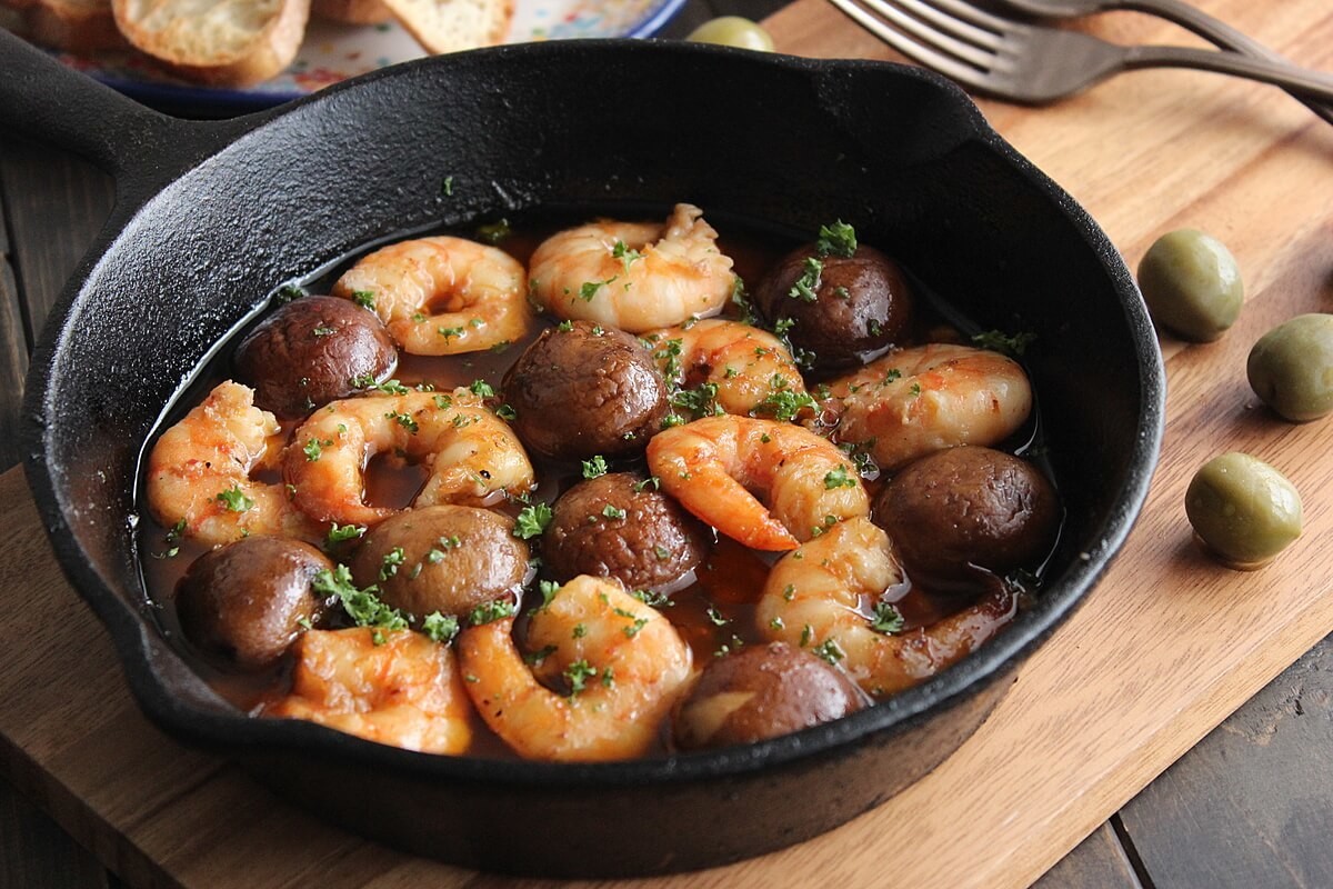 ハワイアンチョップドガーリックオイルを16cmほどの大きさのスキレットやフライパンに適量入れ(エビやマッシュルームがひたひたになる程度)、マッシュルームを入れて煮た後にエビを入れて煮て、塩をして味を調節し、みじん切りにしたパセリをかければ出来上がり!