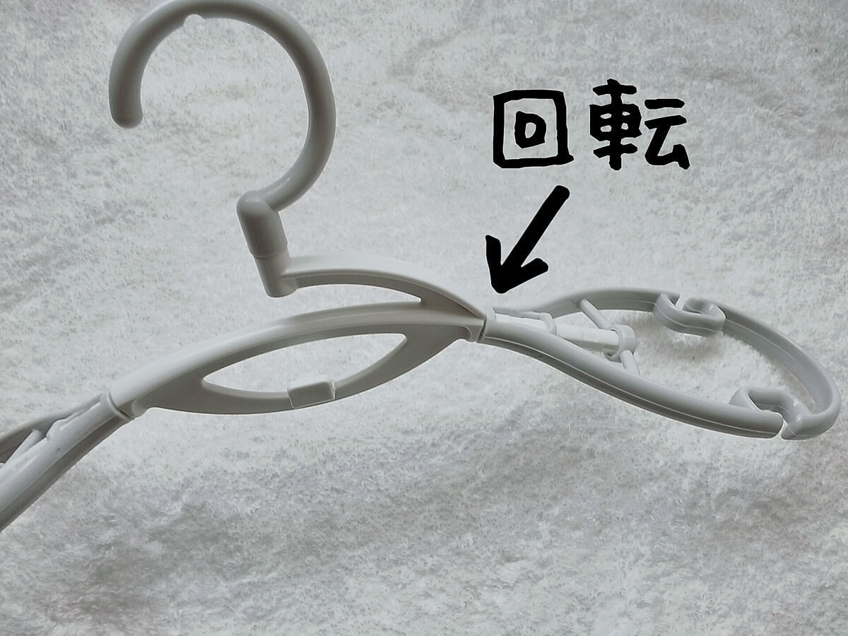 アーム部分は360度ぐるっと回転するので、洋服をかけたときに肩の部分が広がります。そのため風通しが良くなり、洗濯物が乾きやすくなる、という仕組み。
