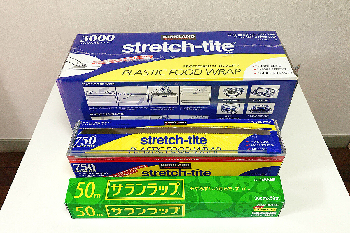コストコのフードラップは3000フィート(約914m)と750フィート×2本セット(約460m)の2種類あります。置き場所を考えると750フィートのほうが使いやすいです。