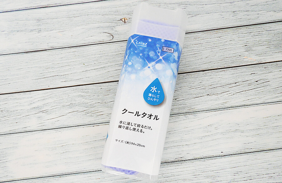 様々なショップでも見かける、首に巻くタイプのクールタオル。暑さが苦手な私は気になっていましたが、なかなか購入には至りませんでした。カインズオンラインショップをのぞいてみると、通常価格398円(税込)のところ298円(税込)とセールしていたため、試しに買ってみました。サイズは94cm×20cmと長め。