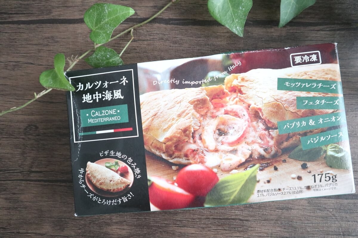 業務スーパーの「カルツォーネ地中海風」175g1人前298円。原産国はイタリアです。カルツォーネとはピザ生地で具材を三日月形で包んで焼いたものです。