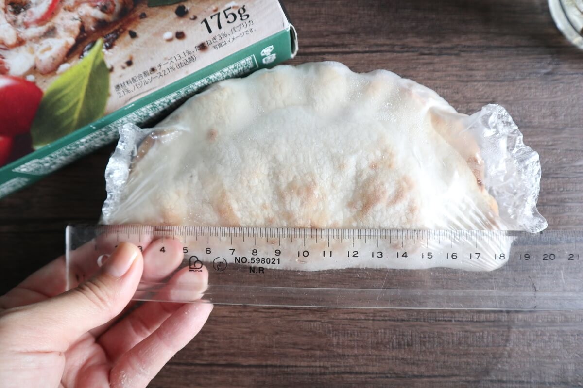 食べ方は、凍った状態で袋から出したカルツォーネを耐熱皿にのせて500Wの電子レンジ3分加熱して、1200Wのトースターで2分加熱します。