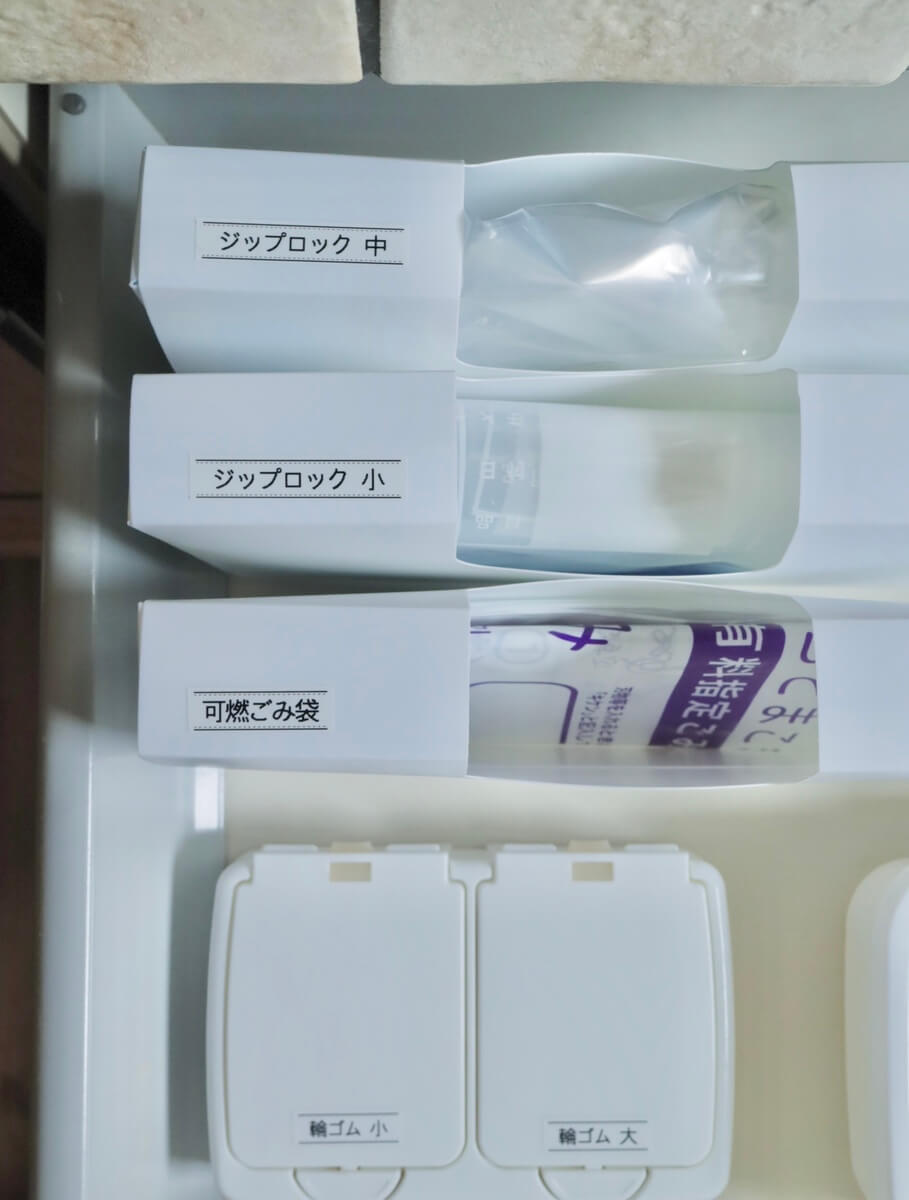 キッチン消耗品収納ケースと同じようにテプラでラベリング。