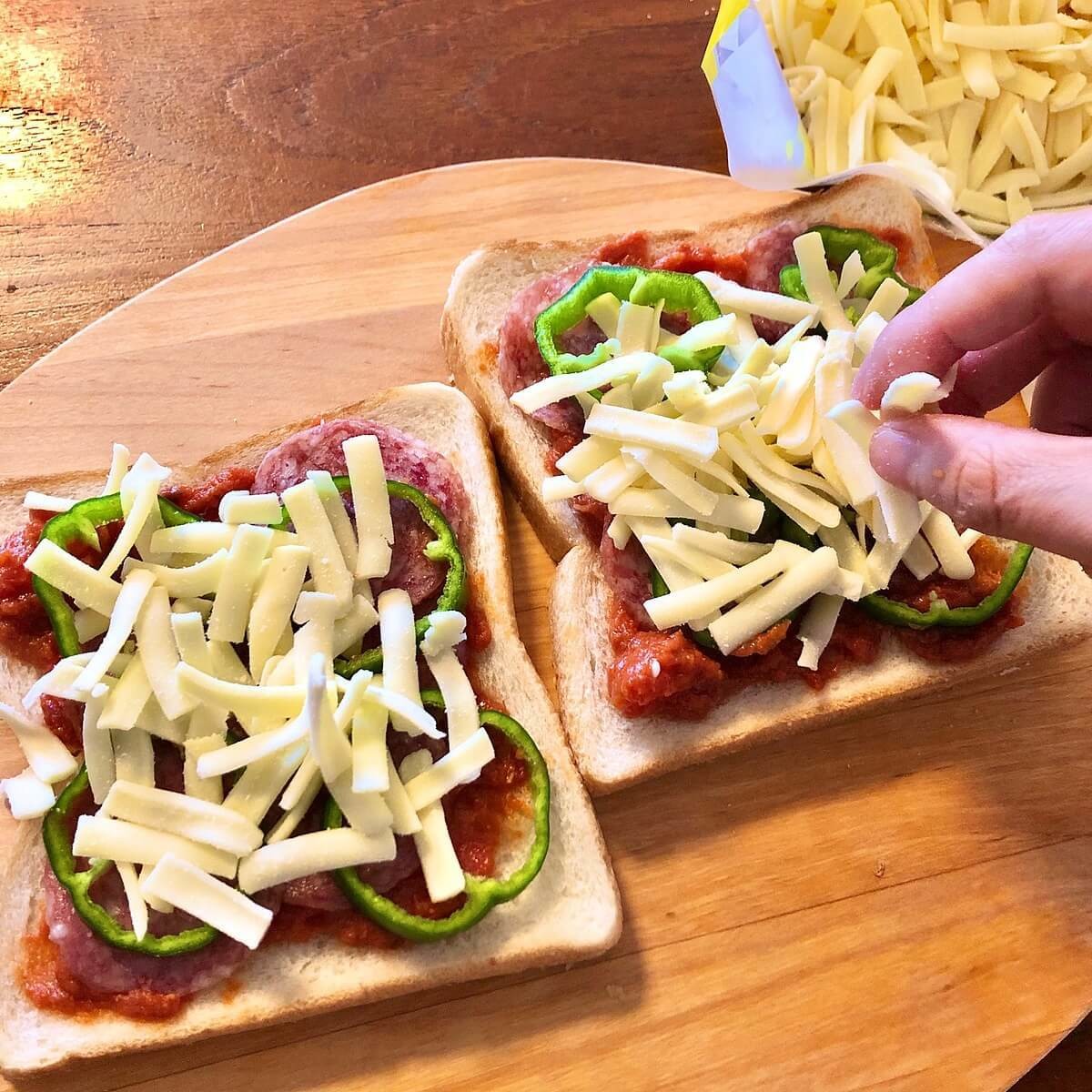 ウインナーやサラミ、ピーマンなど好みの具をのせて、最後にチーズを大量にマシマシ。