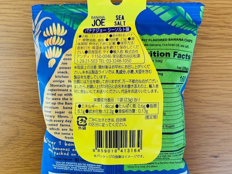 こちら、一見ポテチのようですが、薄切りにしたバナナチップスです。3種類展開のようで、他には『BBQ味』『タイスイートチリ味』がありました。初めて買うのでシーソルト味にしてみました。