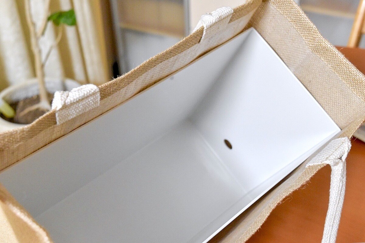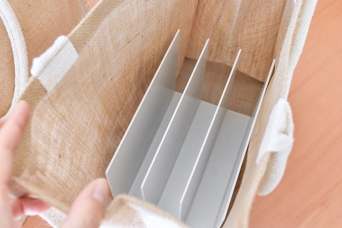 ジュートマイバッグと、スチロール仕切りスタンドを組み合わせて、