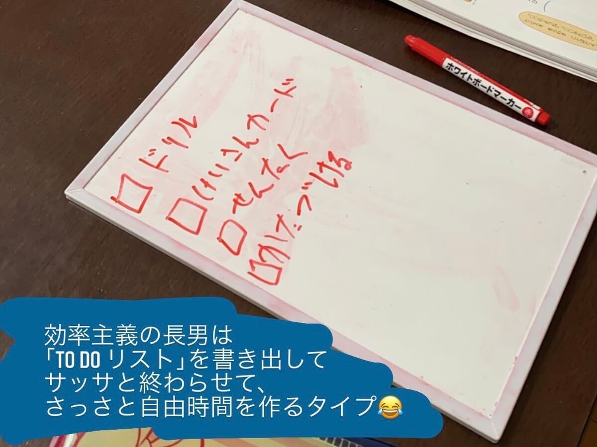 何度も何度も「宿題やりなさーい!」と怒るのは、大人も子どももストレスですよね?そこで始めたのが、「やることリスト」でした。子どもは耳から入る情報よりも、視覚から入る情報の方が理解しやすいんです。