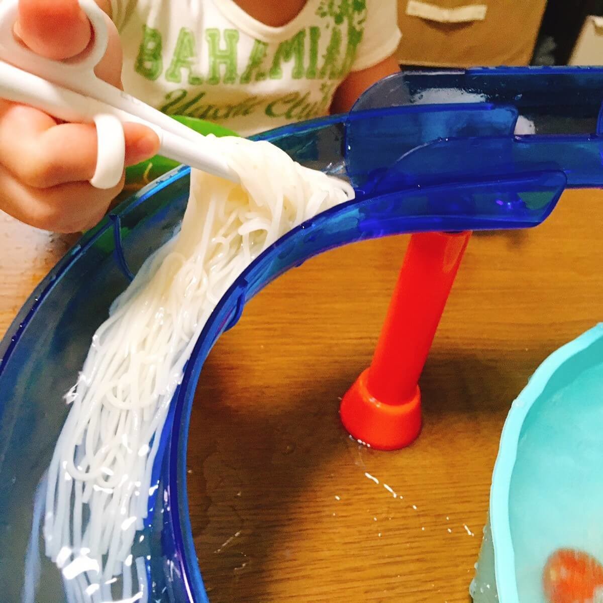 そうめんを小さめのかたまりにして流すと、子どもでも取りやすいみたいです。