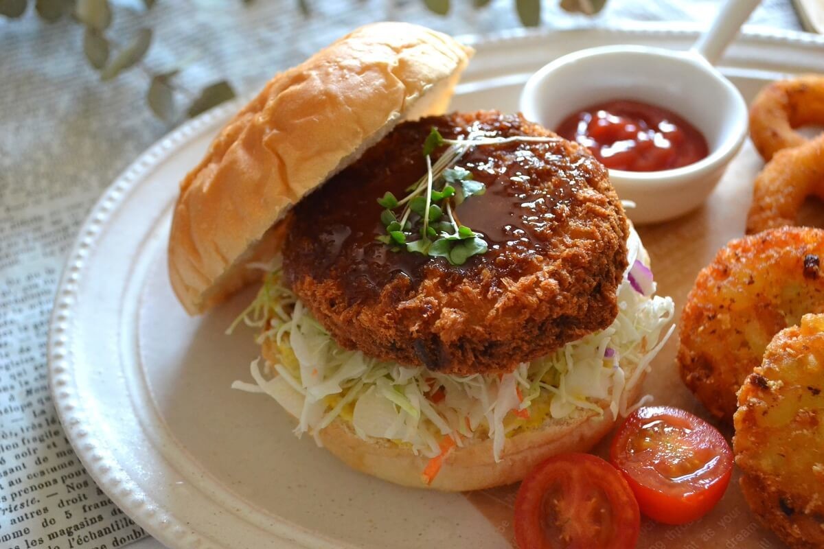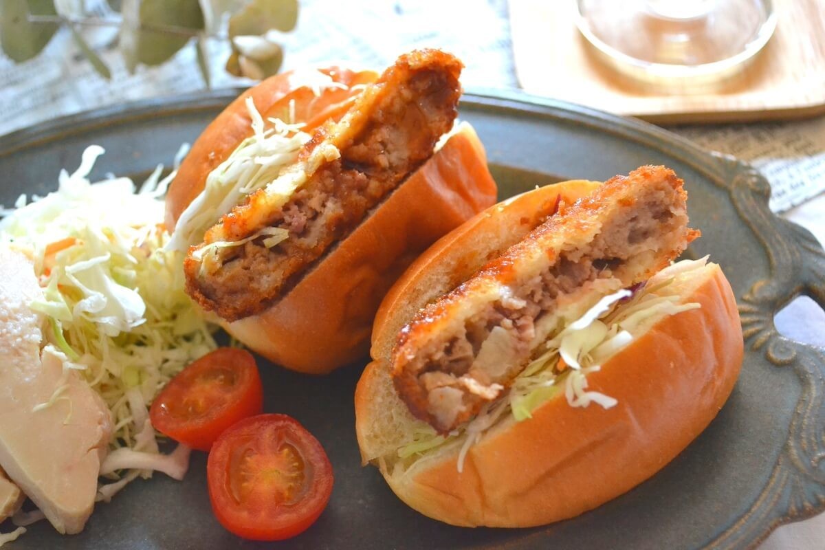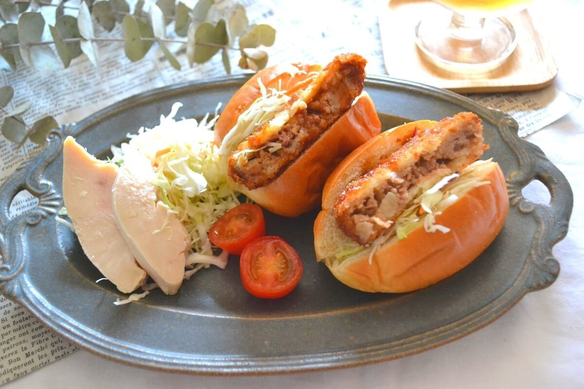 パンの種類を変えて、バンズに千切りキャベツとメンチカツをサンドし中濃ソースをかけスプラウトをのせたら、メンチカツバーガーのできあがりです。