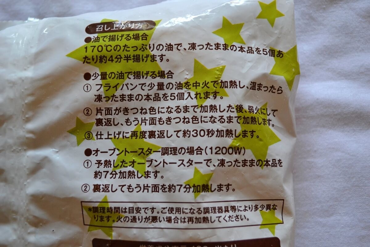 調理方法は、油で揚げるかオーブントースターで加熱します。