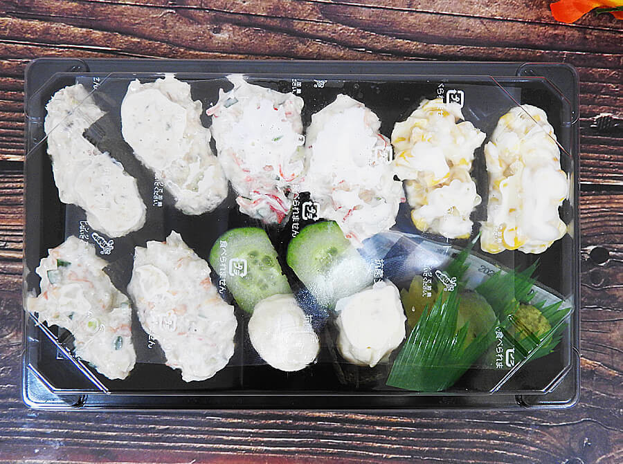 まだお刺身が食べられない子ども達用に注文したくら寿司「人気サラダ軍艦セット」500円(税抜)。マヨネーズで和えた5種類10貫の軍艦ネタが入っていますよ。