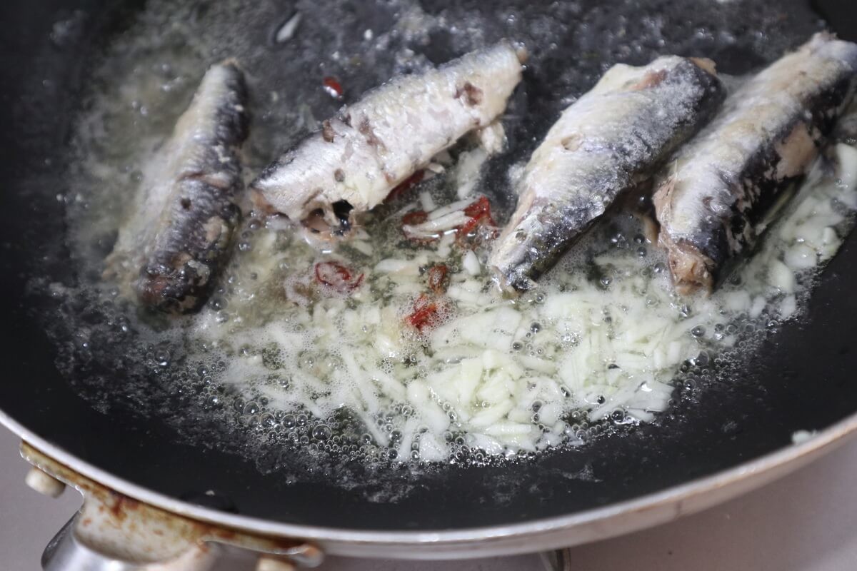 2.フライパンに、オイルサーディンを油ごと入れて中火にかけて、ニンニク、鷹の爪を加える、香りがたったらパスタのゆで汁をお玉一杯分加える。