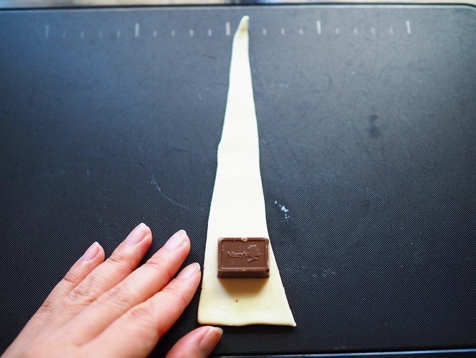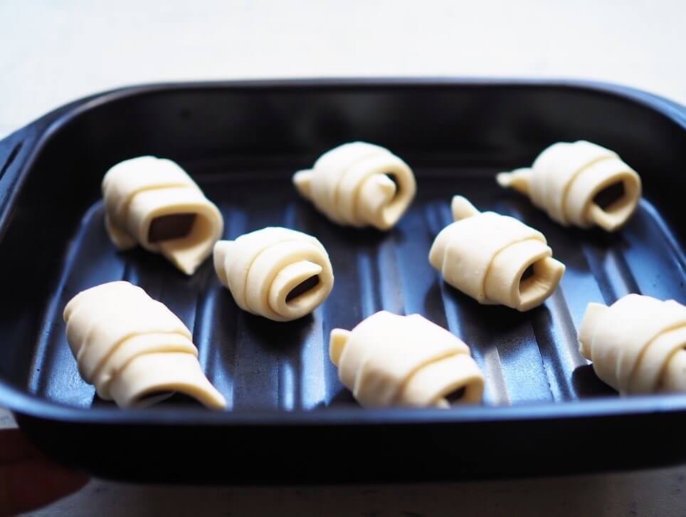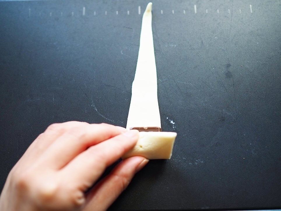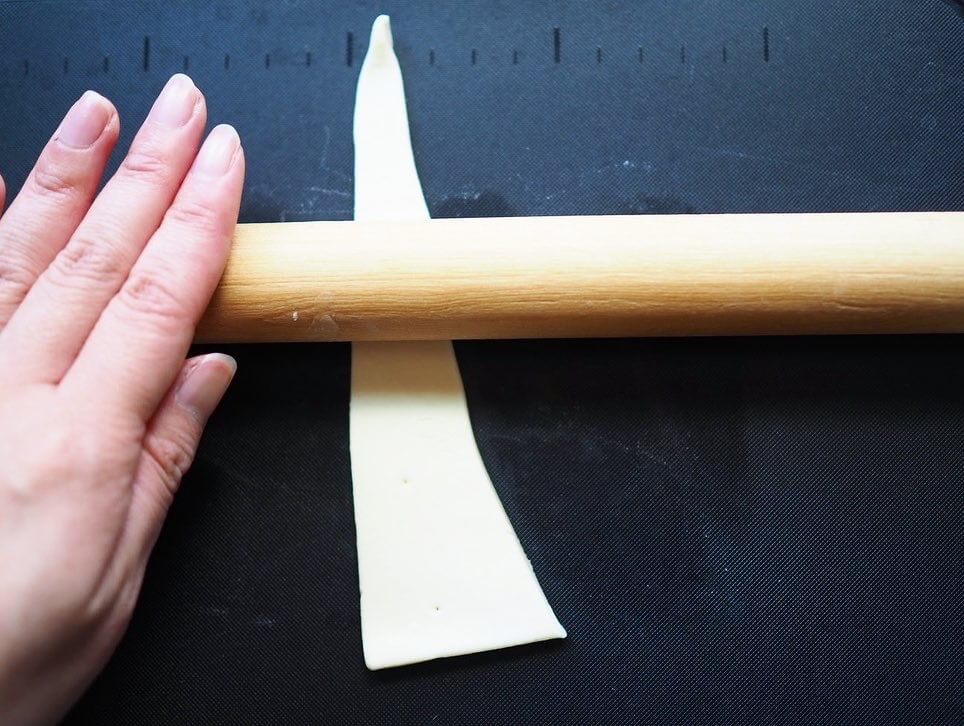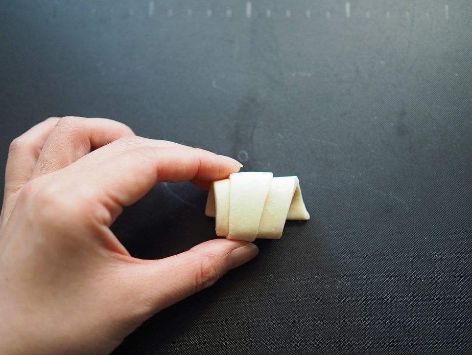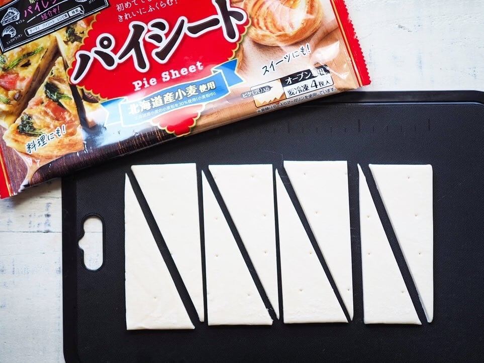 解凍したパイシート1枚を四等分し、さらに斜め半分にカットして8個分用意します。