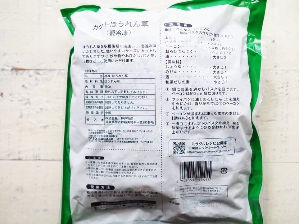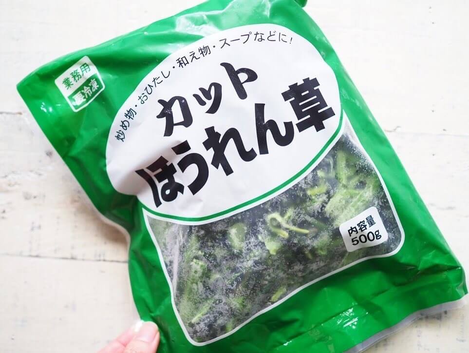 まずご紹介するのは、業務スーパーの冷凍食品より「カットほうれん草」です。