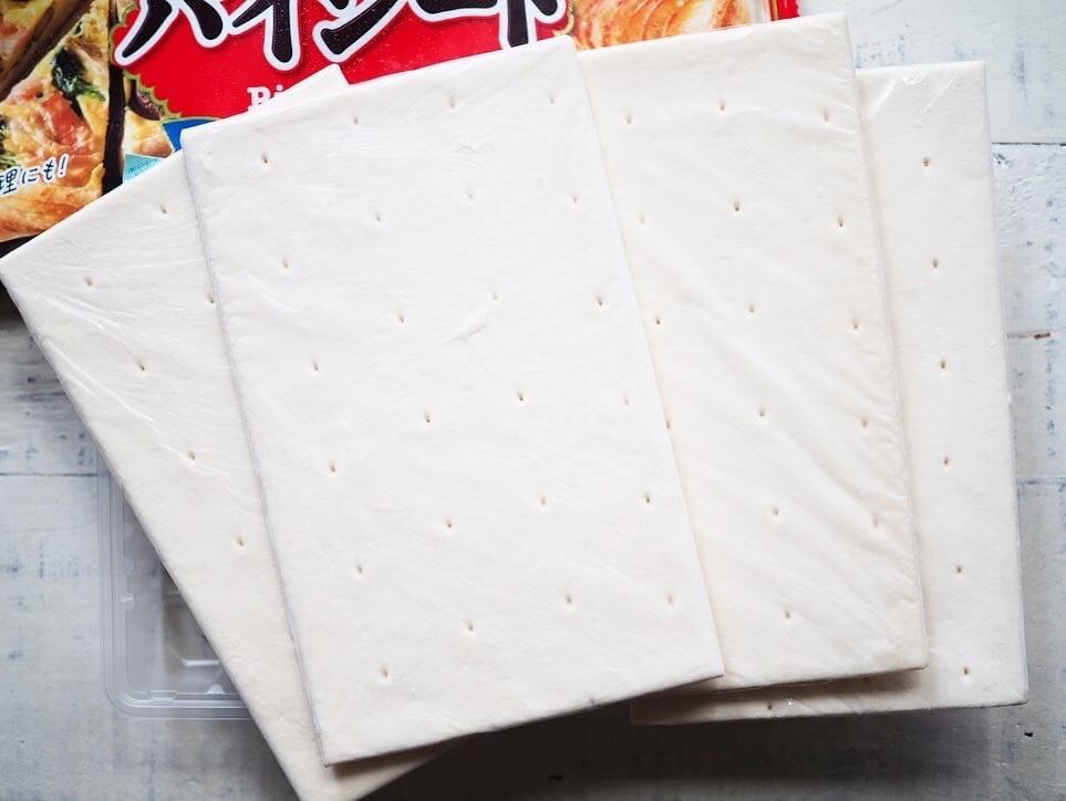 (1)パイシートを常温10分ぐらい放置し解凍、2枚を1cm重ねて並べる
