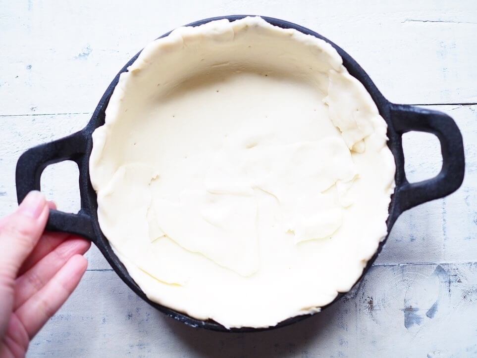 めん棒でパイ皿の大きさにパイシートを伸ばし、パイ皿に置いて余分な生地を切り取ります。