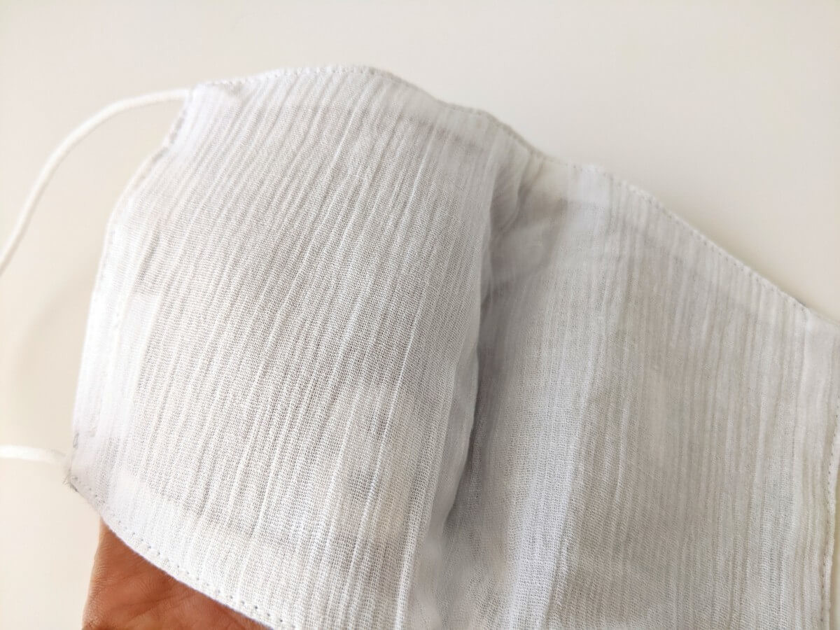 マスクに使っている生地は、吸湿性と速乾性に優れた「高島縮」。 表面に凹凸のあるシワが作られており、薄手でさらりとした風合いの生地です。