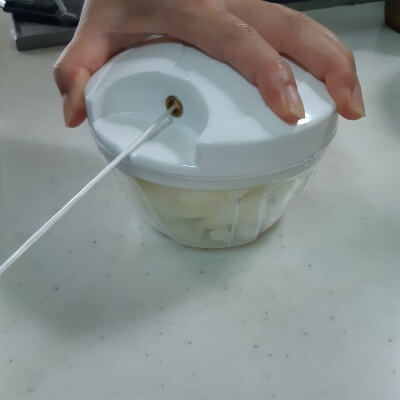 最初はかたくてなかなか引っ張れないんですが、3回くらい引っ張るとスルスルと動きみじん切りが出来上がりますよ。