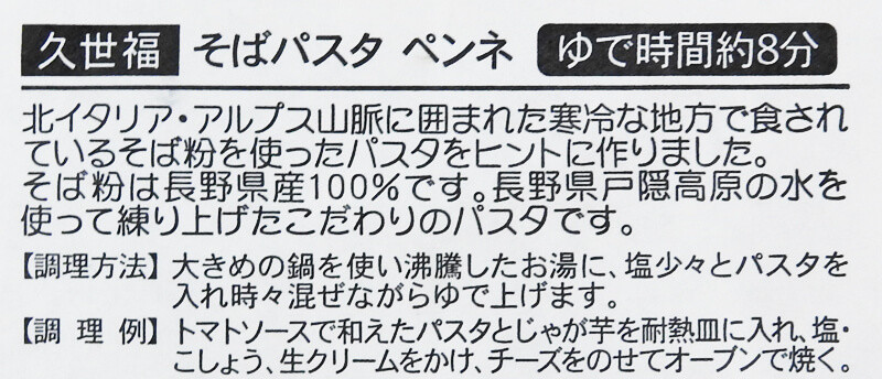 100%長野県産のそば粉を配合して作られた久世福商店「そばパスタ ペンネ」288円(税込)。そばパスタ ペンネの色合いもそばっぽいですね。