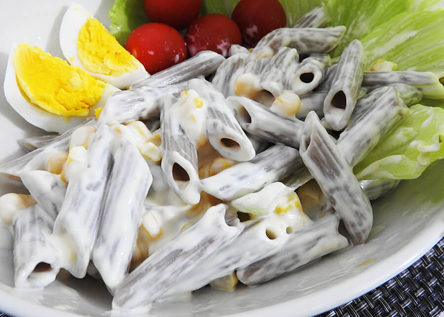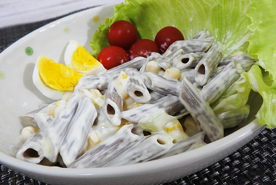そばパスタ ペンネにマヨネーズとコーンを和え、トマトやゆで卵、キャベツを添えて即席サラダを作ってみました。そばパスタ ペンネは、モチモチ感があります。食感自体は普通のペンネを食べているのと、ほぼ違いはないと思います。