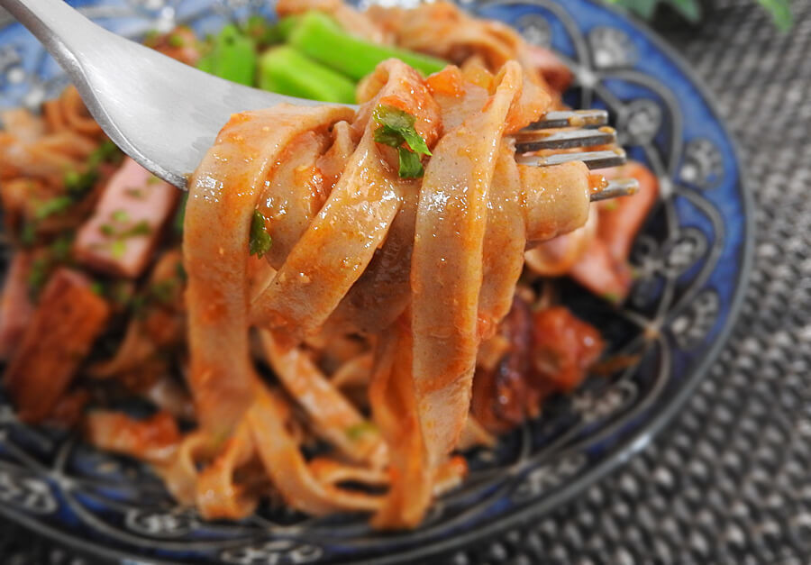 次に紹介する久世福商店「ガーリック&トマト」646円(税込)をかけてみました。ゆでる前はあまり感じませんでしたが、ゆであがりを見るときしめんみたいに平べったくなってますね。トマト系のソースをかけている関係でわかりにくいですが、見た目はそばっぽい。