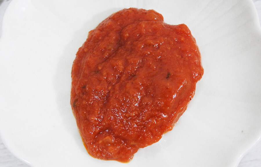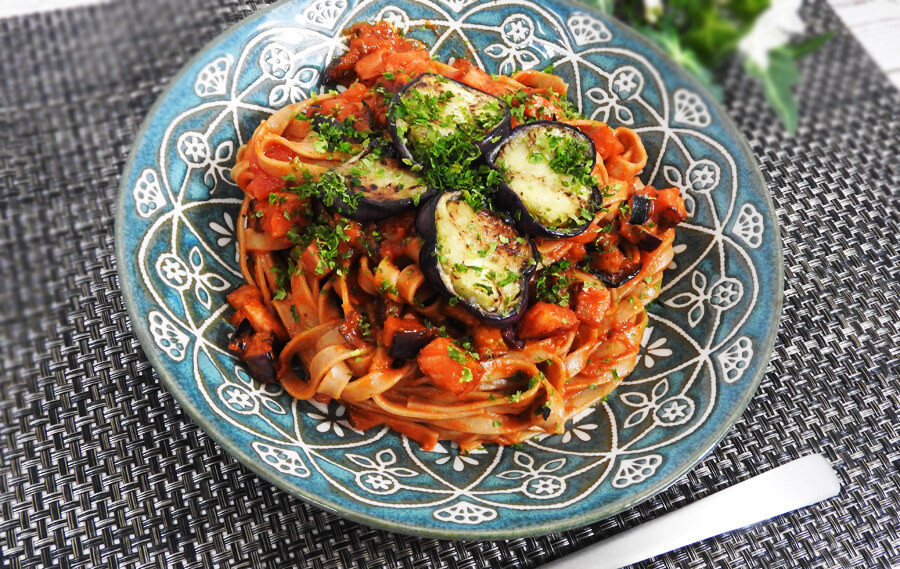 ソースをよくみてみると、なるやトマトが固体のままゴロゴロと転がっていました。ソースはもったりとしており、なすやトマトとの一体感がありますね。みその香りは……あまり漂ってこない……。夫が言うのは「みそのニオイもする」とのことでしたので、そこそこみその割合は高そうです。