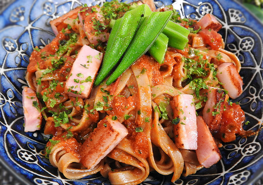 ゆであがったパスタに混ぜるだけで完成。さきほど紹介した「そばパスタ フィットチーネ」に混ぜ合わせてみました。見栄えをよくするために、おくらやベーコンも一緒にトッピングしていますが、「ガーリック&トマト」だけでも充分本格的な味わいが楽しめますよ。