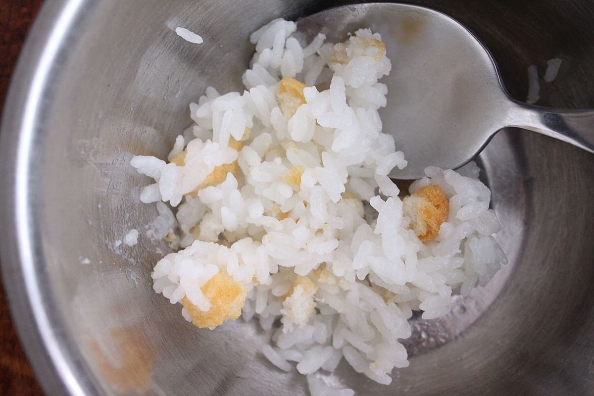 スプーンで、揚げ餅をザクザクくだきながら混ぜます。