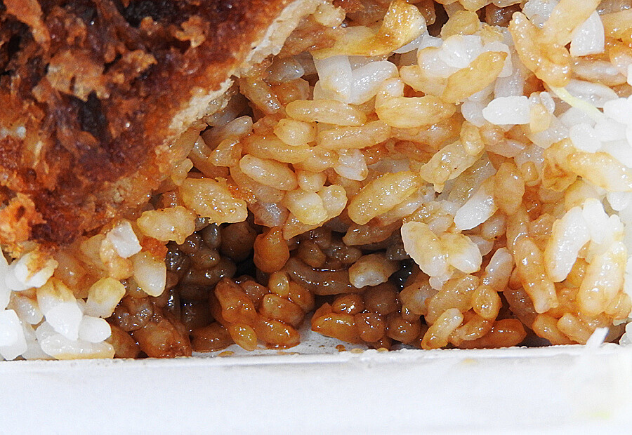 「ソース」をメインとしているだけあって、ごはんの中身を見てみるとソースがドバドバと染みていました。これだけソースがかかっていると、結構お腹が重い……。一番サイズの小さい「ソースカツ丼弁当(梅)」でもお腹いっぱいになりますね。