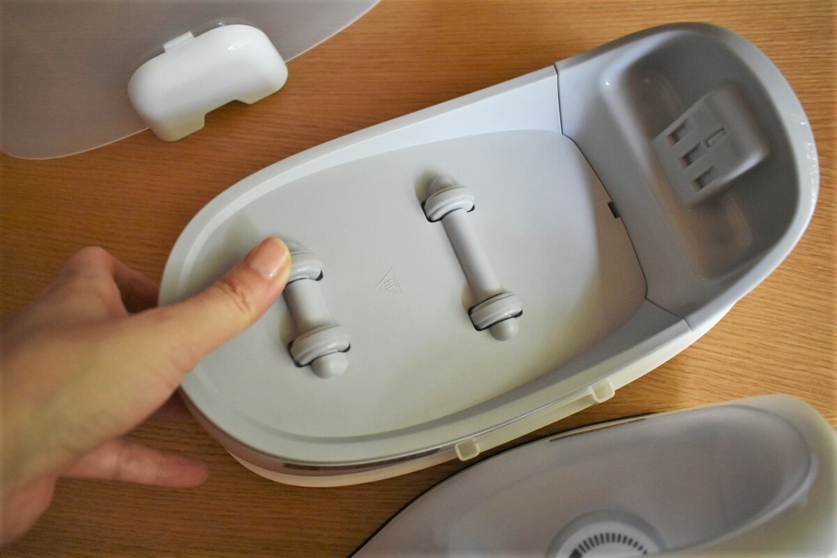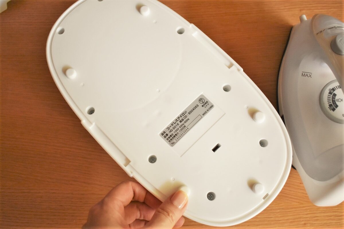 また、裏側には突起が5箇所あるのですが、そのうち筆者の親指がある箇所とその対角の突起が「ゴム」になっていて、それのおかげでアイロンを取り出すときにスタンドが動いてしまうということは一切ありませんでした。