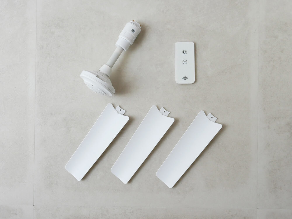 本体 ×1、ネジ ×3個、羽根 ×3枚。ON/OFF のリモコン付き。