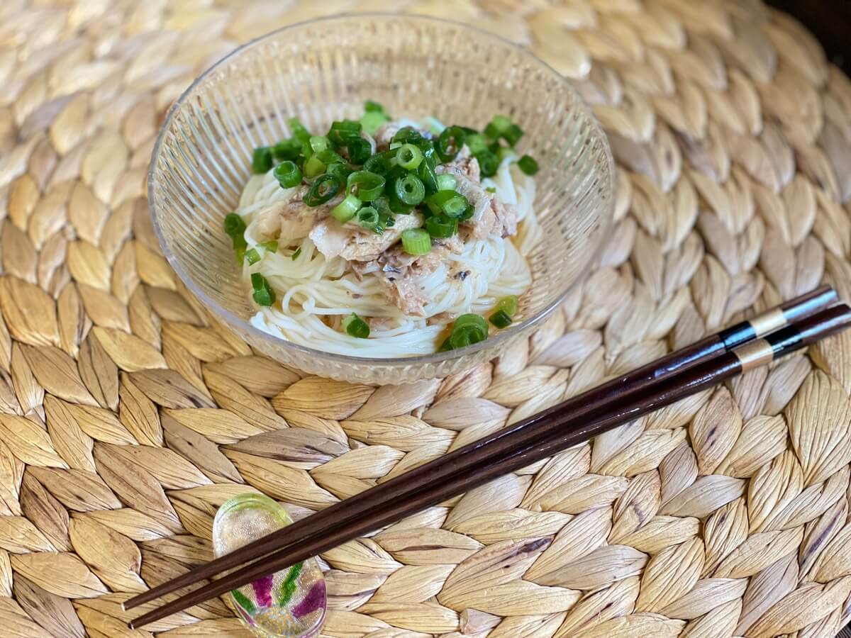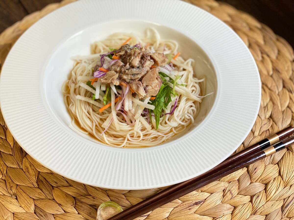 「オイルごと使えるオリーブオイルさば」を使うと、ちょっとおしゃれなそうめんアレンジもできちゃうんです♪
