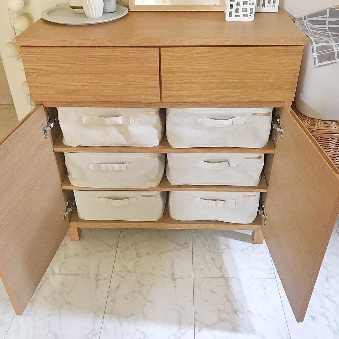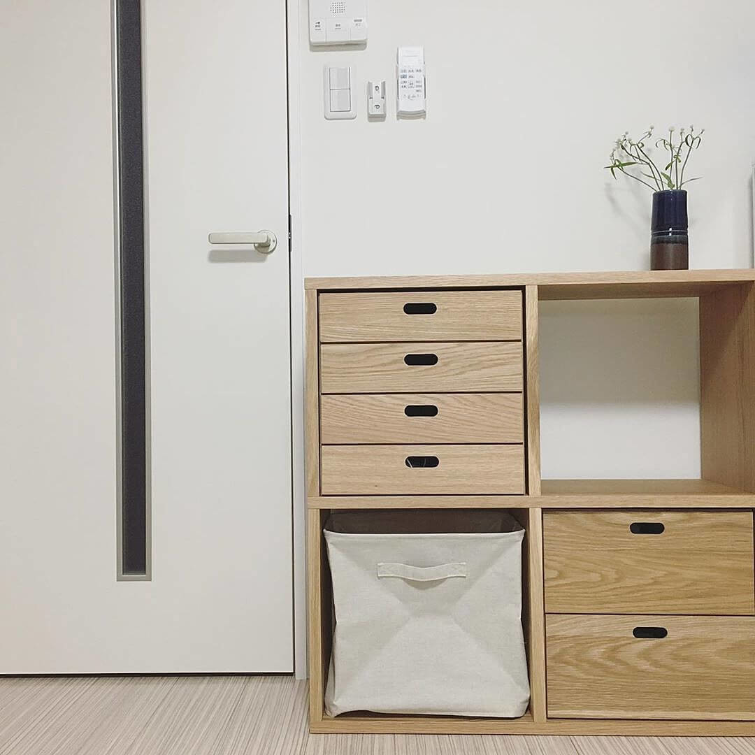 オーク材を使用した木製扉でゴチャつきがちな小物も綺麗に収納できます。サイズ感がちょうどよく、リビングから玄関まで場所を選ばず置けるのが魅力です。 yamatowa1313さんは、玄関に置いて子どもたちの学校グッズを収納しています。