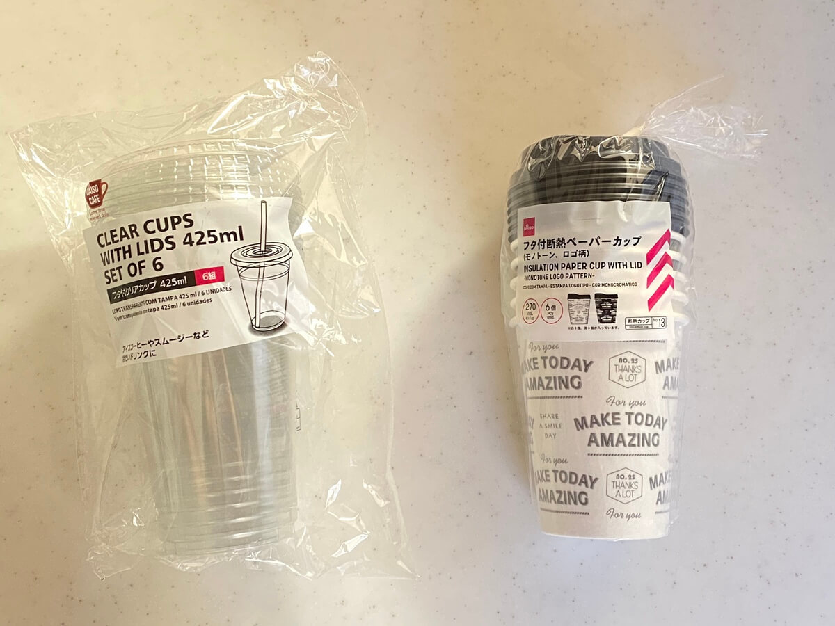 冬場はダイソーの蓋付き紙コップに、夏場は同じくダイソーのプラスチック容器に入れています。リユーザブルではないので、タンブラーと比べるとコスパは劣ります。ですが、カフェやコンビニで買うのと比べれば、かなりの節約になるので、季節を問わず欠かさずにストックしています!
