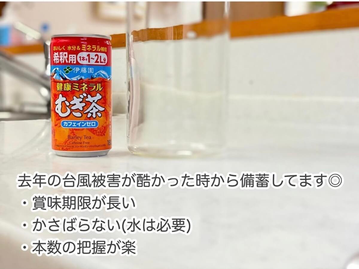 夏場の災害で1番怖いのは熱中症です。そこで、手軽にミネラルを補給できる濃縮タイプのドリンク缶を購入しました。子どもたちも普段飲み慣れている味だし、アレルギー27品目不使用なのも安心!あらかじめ水をストックしておけば、手軽にお茶が作れます。