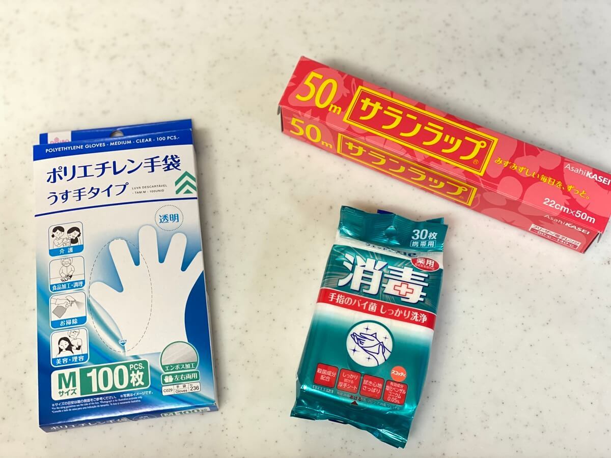 また、水道が止まってしまうと手を洗ったり、食器を洗うことができないので、100均の手袋とラップを多めに購入しました。今は感染症対策も兼ねて、除菌アルコールグッズがあると安心ですね!