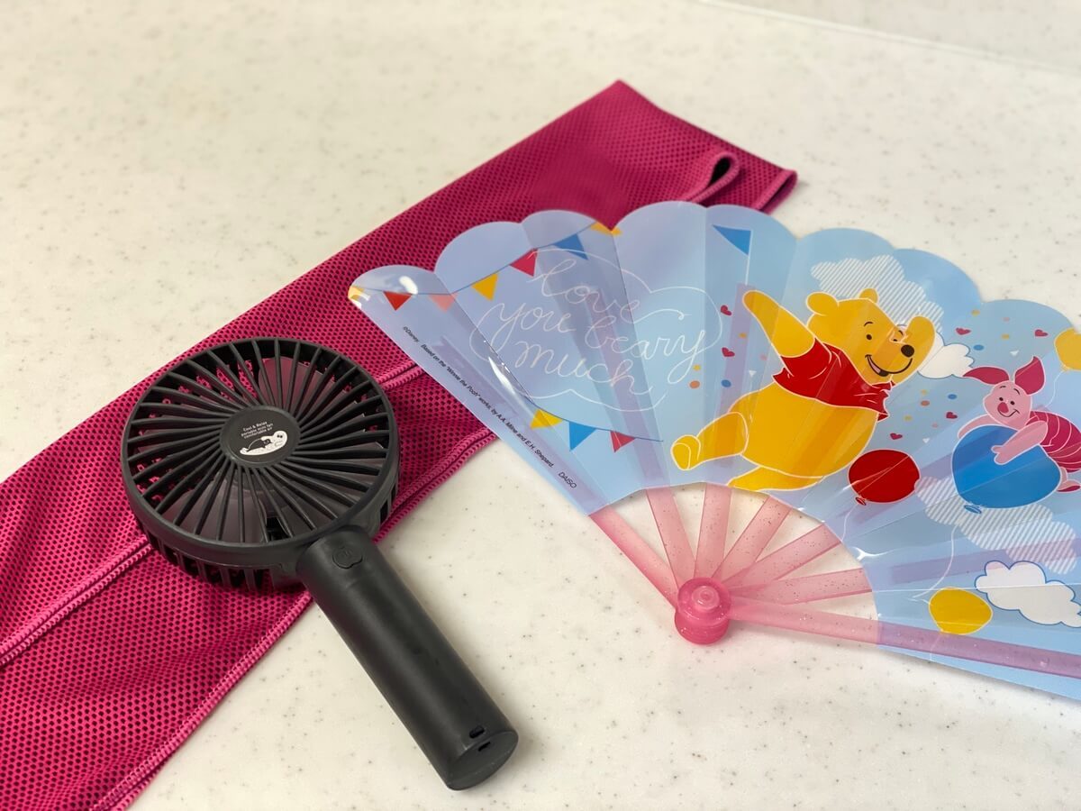 熱中症対策として、体を冷やせる靴も購入しました。例えば、充電式の扇風機や、うちわ、濡らすとひんやりするタオルがオススメです。