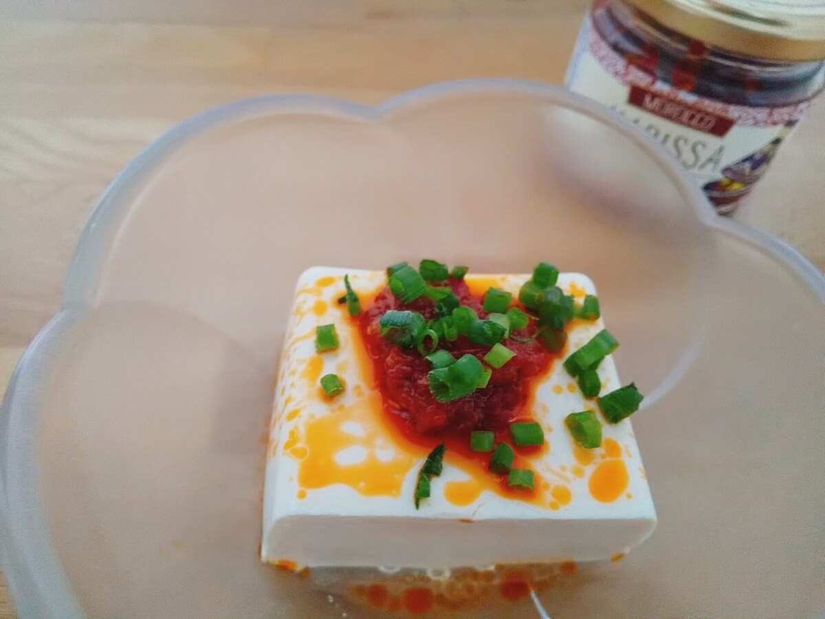……ごめんなさい、見栄を張りました。豆腐にハリッサをのせただけの手抜きメニューです……。