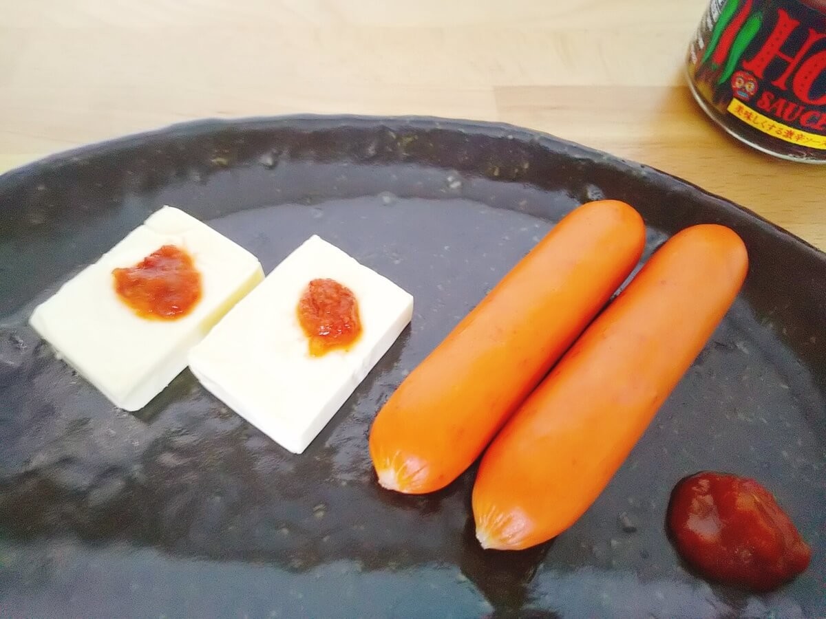 左は「ピリ辛チーズ」。ベビーチーズにソースをちょいのせしたら完成。チーズのマイルドさに激辛ソースがベストマッチしたおつまみです。