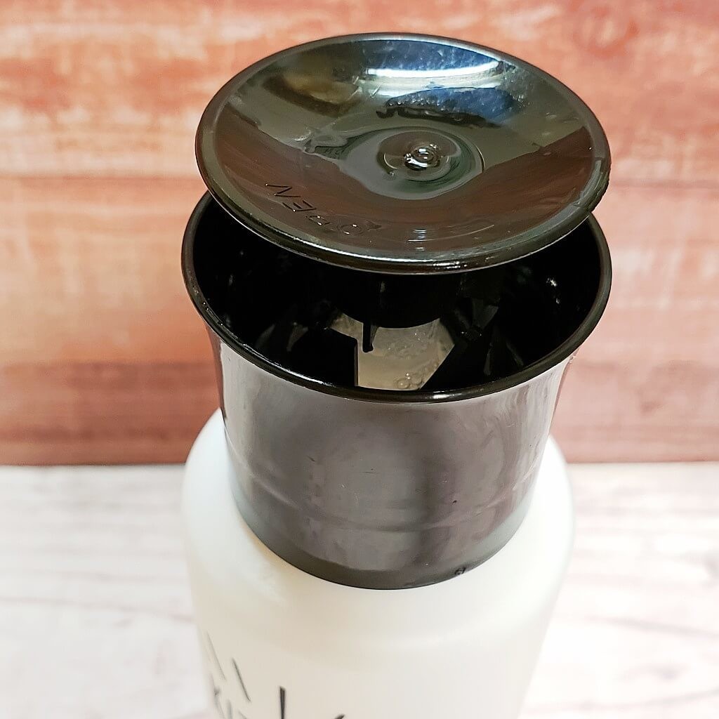 液体洗剤を詰め替える際は、トップの黒い部分を回転させると、本体から外れます。シンプルなデザインなので、作りも簡潔。本体に普段使っている食器洗い用液体洗剤を入れて、再度フタを締めたら完成です。