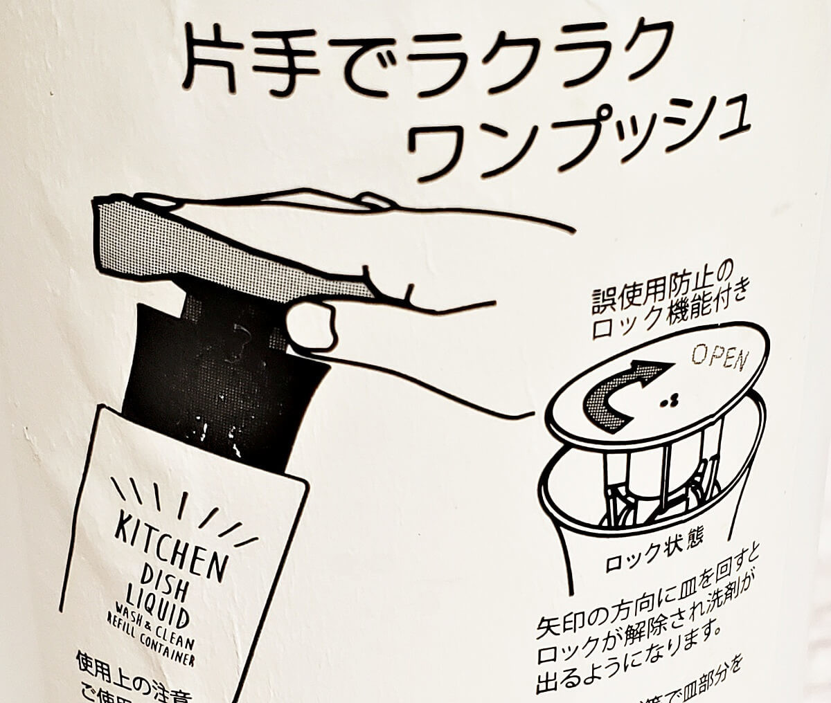 背面の説明書きラベルを見ると、このボトルの最大の魅力「片手でラクラクワンプッシュ」の文字が大きく書かれています。