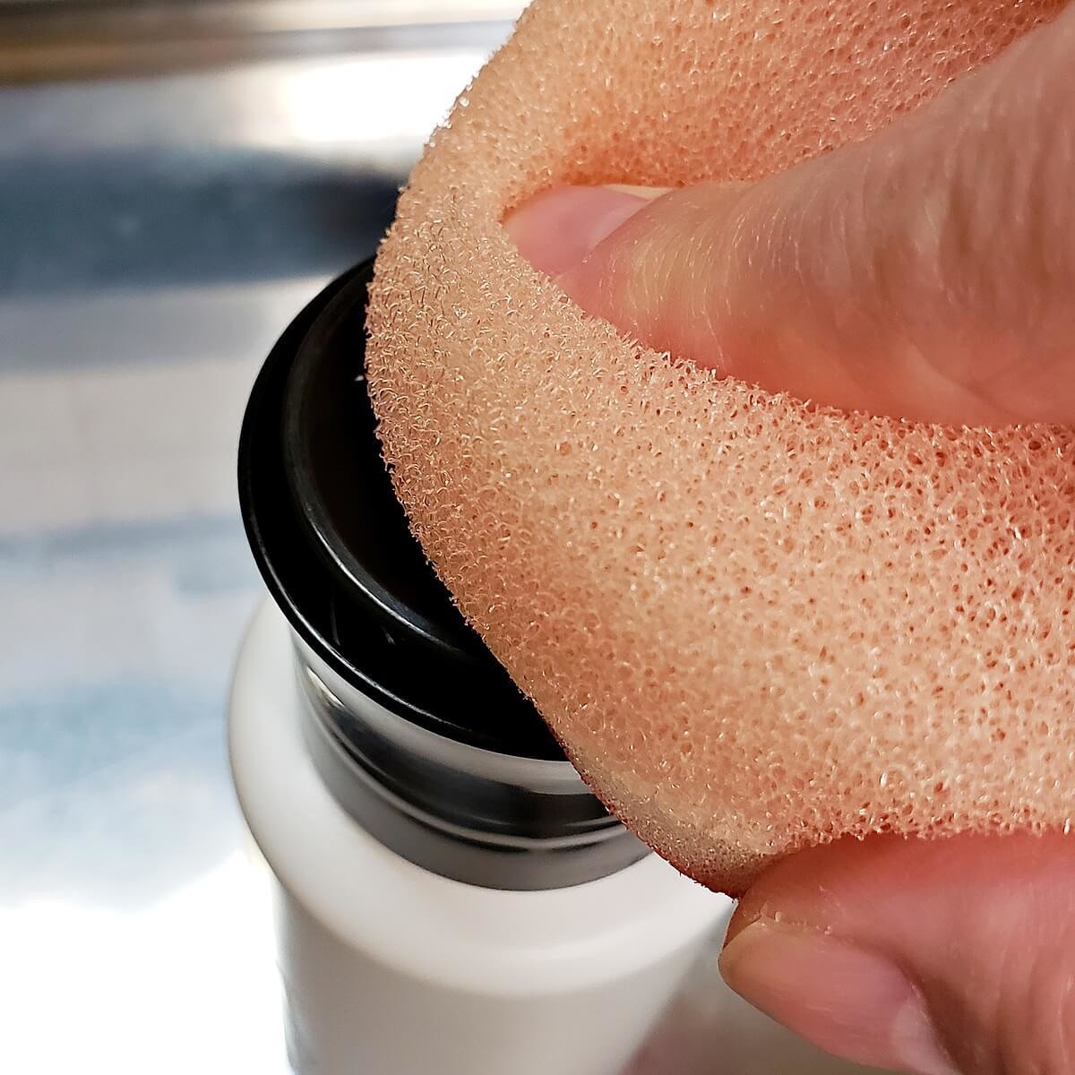 ラベルの説明書きのとおり、スポンジで軽く上部のお皿の部分を押さえてみました。洗剤が出る音や感触はとくにないので、最初はちょっと不安になるかもしれません。