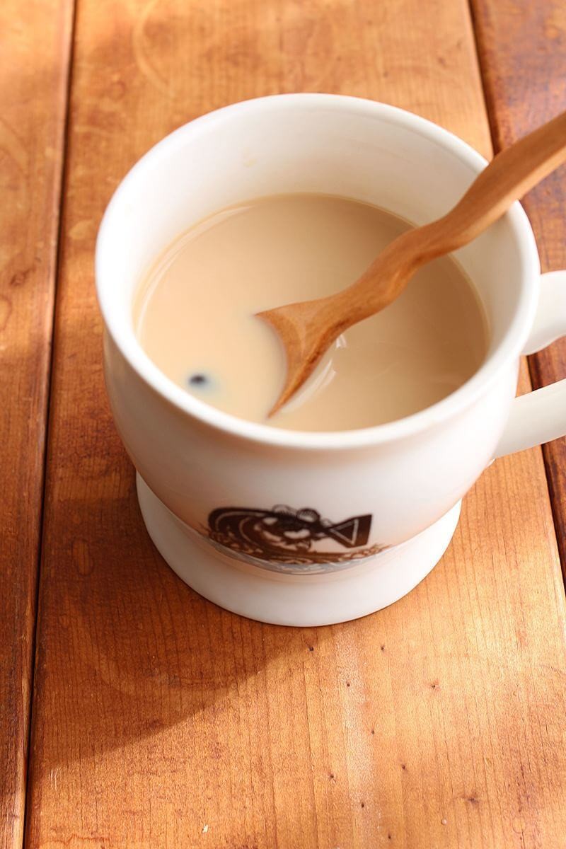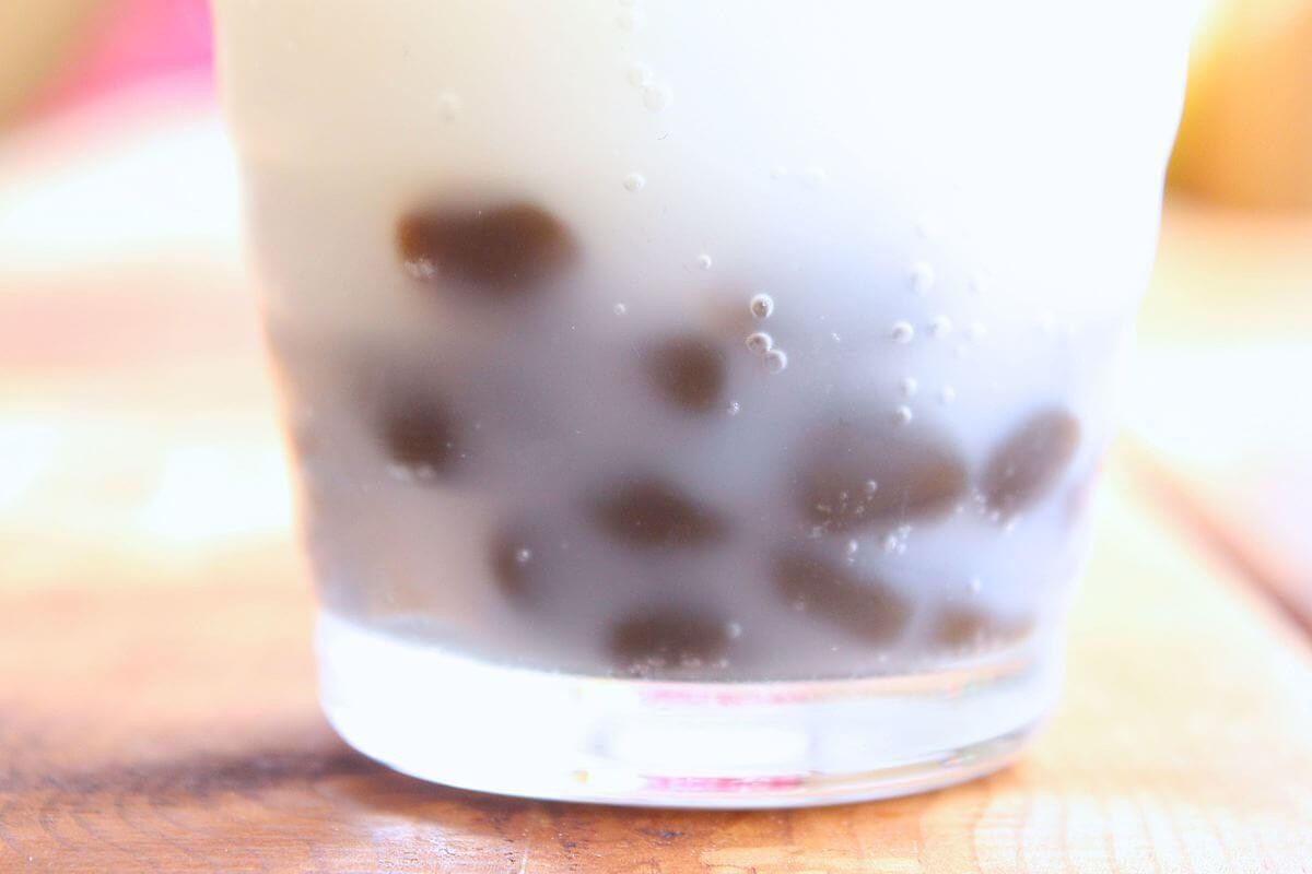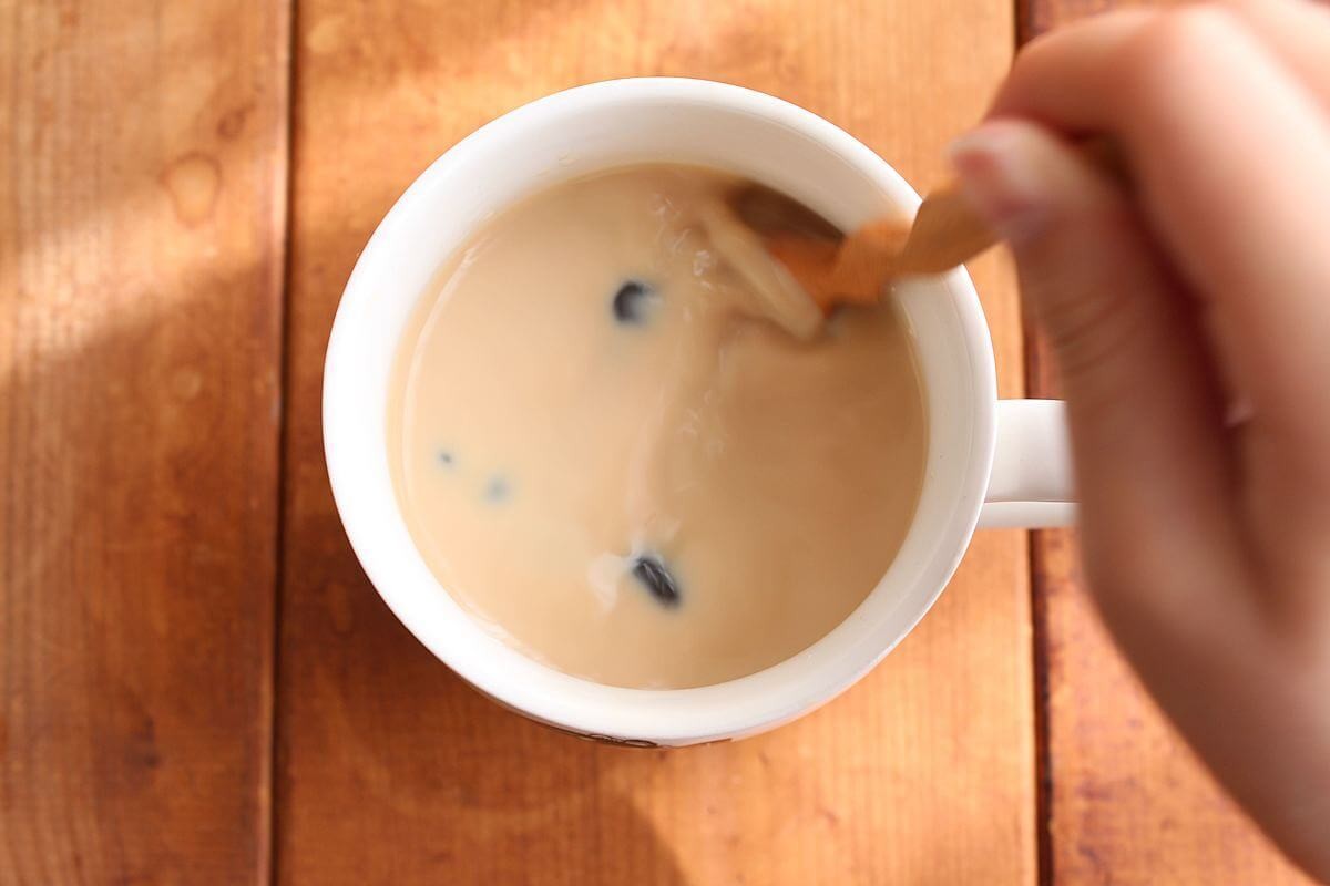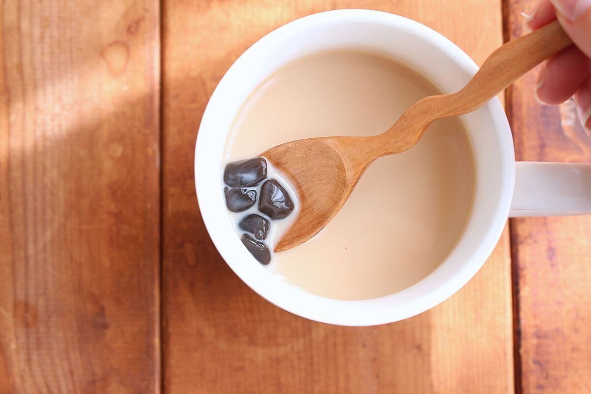 ホットのミルクティーにタピオカを入れて、スプーンでタピオカをすくいながら
