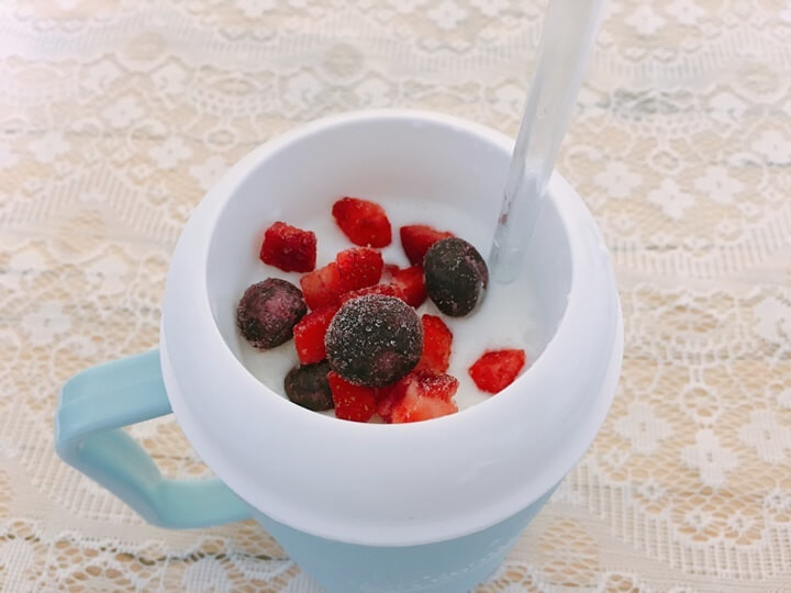 せっかくなので、スリーコインズの公式アカウントを参考にアレンジに挑戦してみました。まずは、ヨーグルト+冷凍フルーツ。