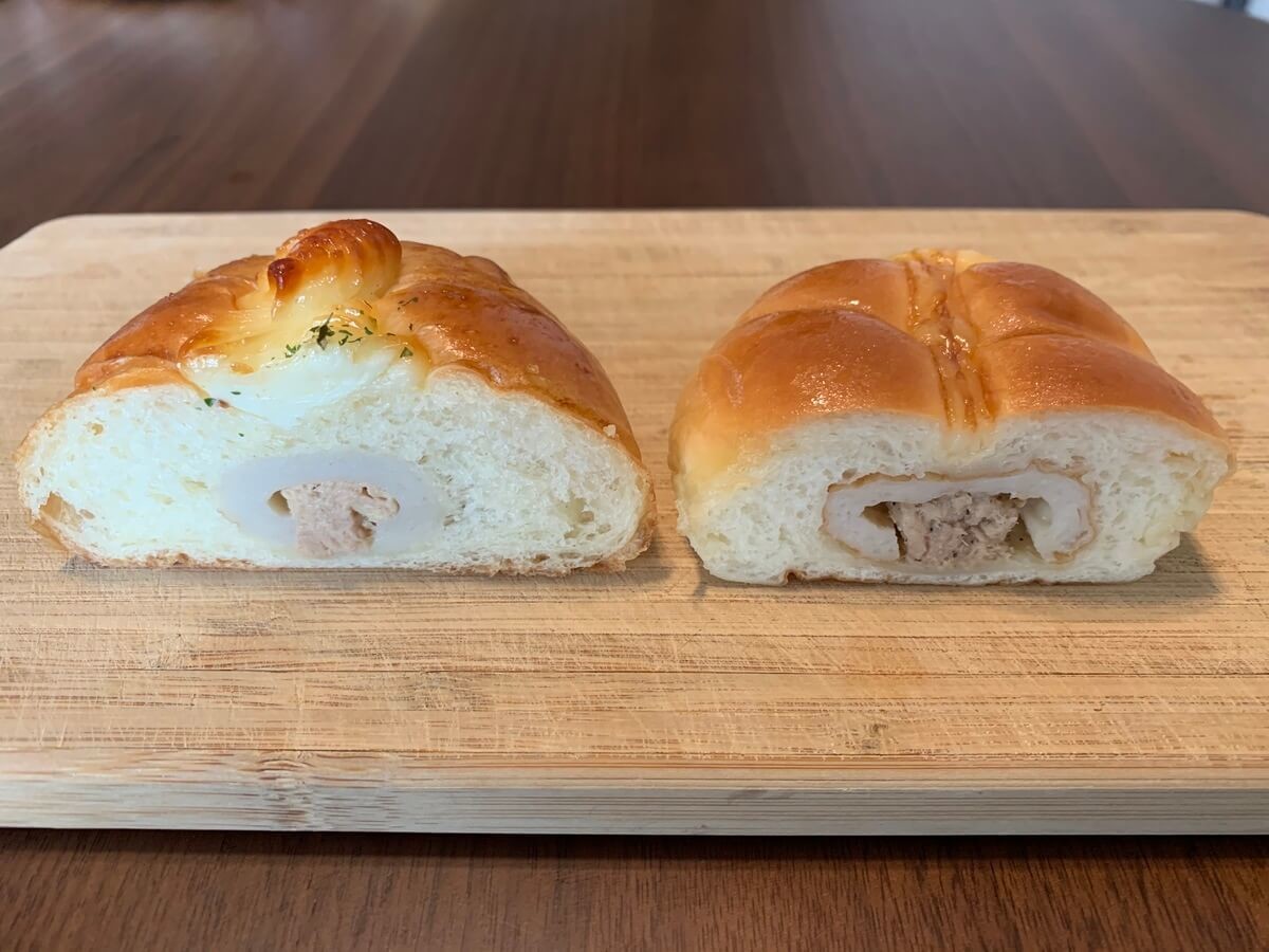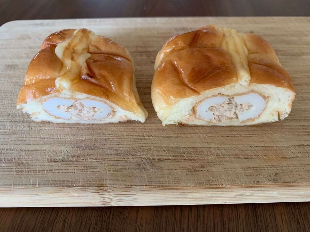 モチモチしたちくわは、ツナサラダとパンの間で、クッションのような役割を果たしていて、一般的なツナマヨパンよりもパン全体の一体感がすごいです。