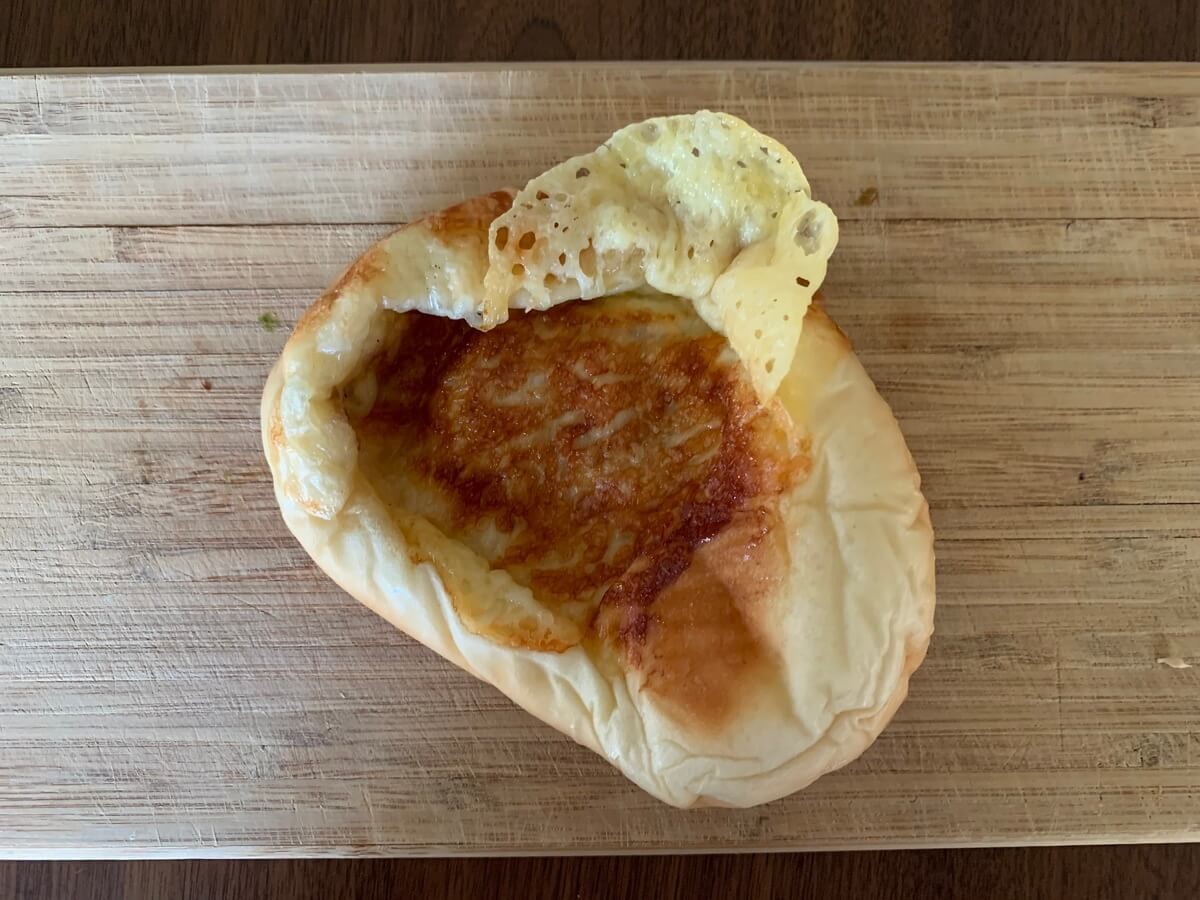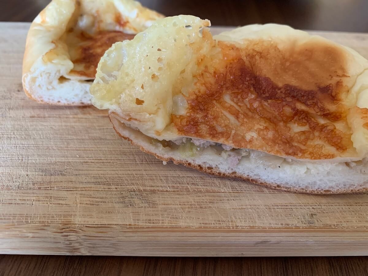 キャベツがたっぷり入ったぎょうざの具が入ったパンです。形もぎょうざっぽいですよね。こんがりした餃子の羽根のような部分はチーズです。