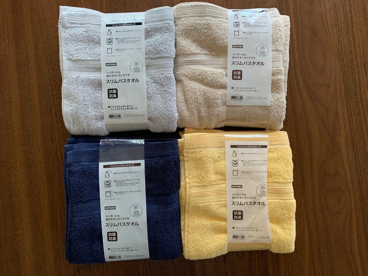 この夏は、子どものお風呂上りには、バスタオルの代わりにフェイスタオルを代用してみたのですが、やはりフェイスタオルでは少しサイズが小さすぎる……そんな時に出会ったのがニトリのスリムバスタオルです。