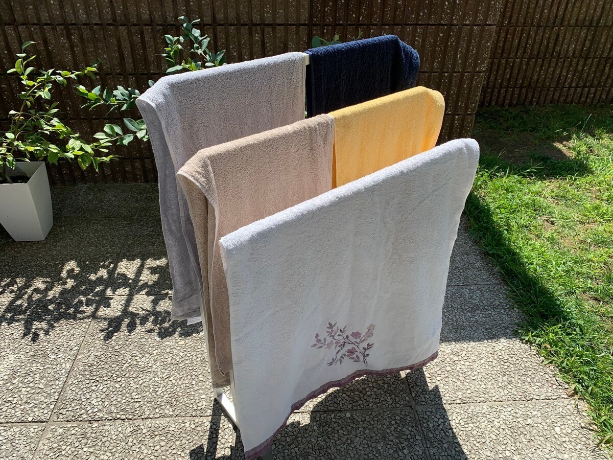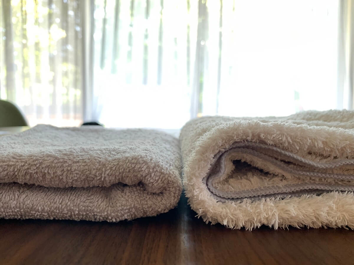 一般的なバスタオルと同じ長さですが、幅は大体半分くらい。なんとハンガーにかけられるサイズなので、洗濯した後、干すのが超ラクチンです。